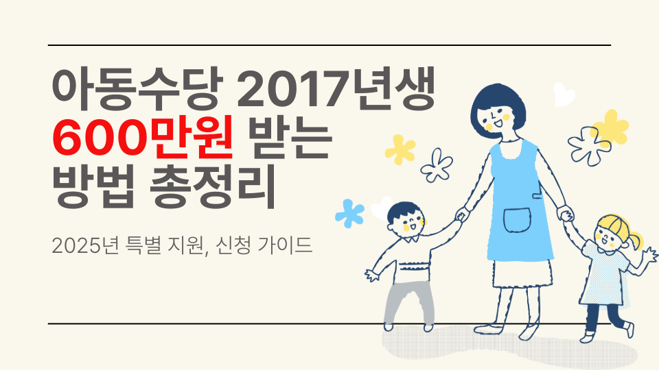 아동수당 2017년생 600만원 받는 방법을 찾고 계신가요? 2025년부터 시작되는 아동수당 2017년생 특별 지원 정책부터 2017년생 아동수당 600만원 지급 내역까지 완벽하게 정리해드립니다. 아동수당 2017년생 대상자 확인, 2017년생 600만원 신청 방법, 아동수당 만 8세 지급 일정까지 모든 정보를 담았습니다. 2017년생 지원금으로 혜택을 받는 아동수당 연령 확대 정책을 놓치지 마세요!