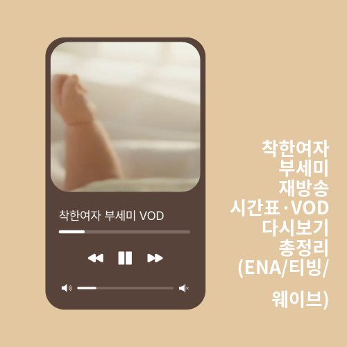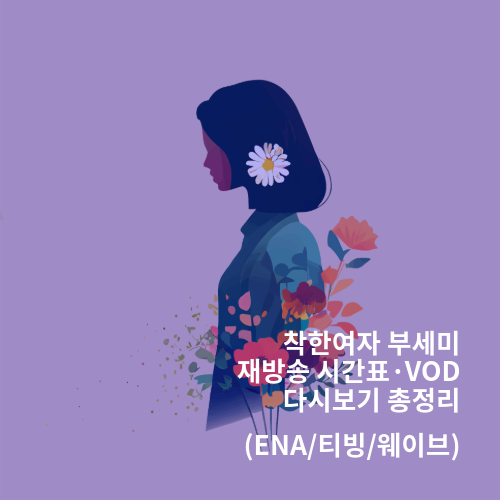 착한여자 부세미 재방송 시간과 VOD 다시보기 방법을 모두 정리해드렸습니다. 착한여자 부세미 재방송은 ENA에서 본방 다음날 오전과 주말 오후에 방영되며, 티빙·웨이브에서는 본방 직후 바로 VOD로 시청할 수 있습니다.