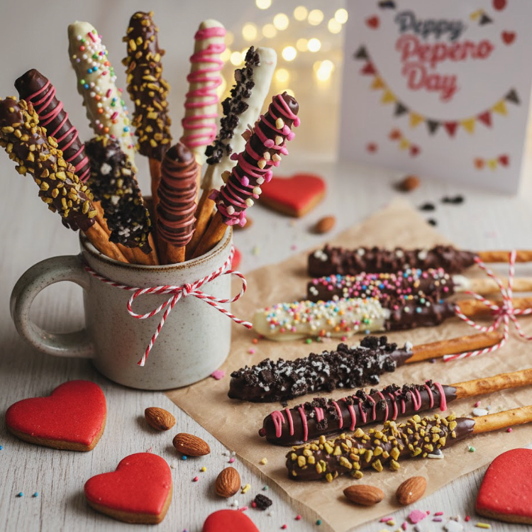 - 투톤 빼빼로: 다크초콜릿 절반, 화이트초콜릿 절반을 입힌 후 각각 다른 토핑을 올리면 매우 인상적입니다.