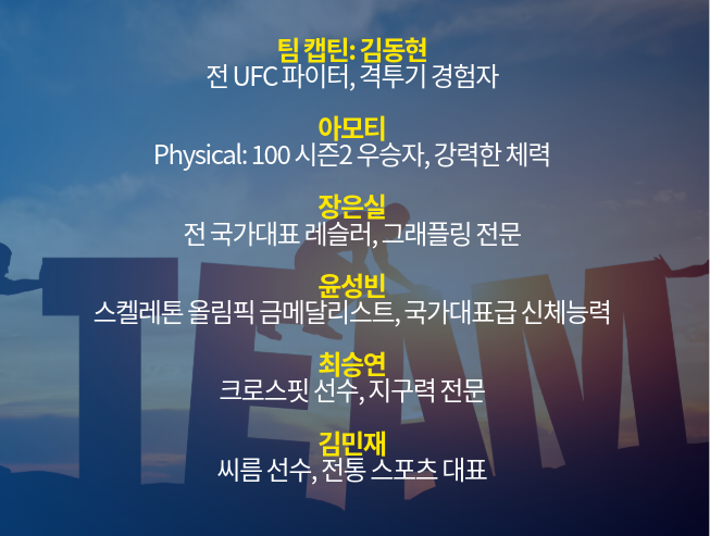 • 팀 구성: 격투기, 체조, 레슬링, 올림픽 메달리스트, 크로스핏, 씨름 등 다양한 분야 전문가