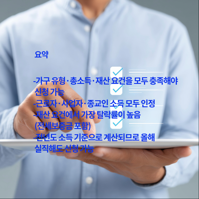 재산 합계가 2억 4천만 원 미만이어야 하며, 1억 4천만 원~2억 4천만 원 사이라면 50% 감액됩니다. 전월세 보증금 비중이 높아 탈락하는 경우가 많으니 주의해야 합니다.