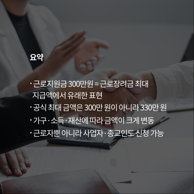 근로지원금 300만원을 검색해보면, 실제로 어떤 금액을 의미하는지 혼란스러운 정보가 많습니다. 많은 콘텐츠가 “300만 원”이라고 소개하지만, 2025년 기준으로 정부가 지급하는 정확한 금액은 최대 330만원이며, 이는 바로 ‘근로장려금(EITC)’ 제도입니다. 아래에서는 실제 지급 구조부터 자격 조건, 홈택스 신청 절차까지 상세하게 정리했습니다.