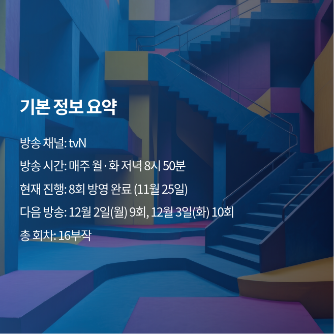12월 2일 10회 방송 이후 작품 완성도를 위해 한 주 쉬어갑니다. 12월 8일과 9일은 휴방하며, 12월 15일부터 11회로 방송이 재개됩니다.