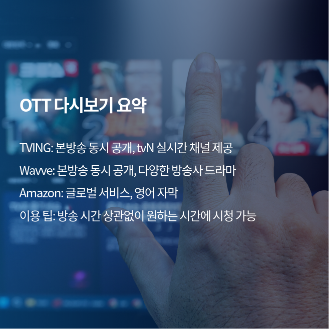 본방송을 놓쳤다면 OTT 플랫폼에서 즉시 다시보기가 가능합니다. tvN 방송과 동시에 TVING과 Wavve에서 서비스되며, 해외에서는 Amazon Prime Video로 시청할 수 있습니다.