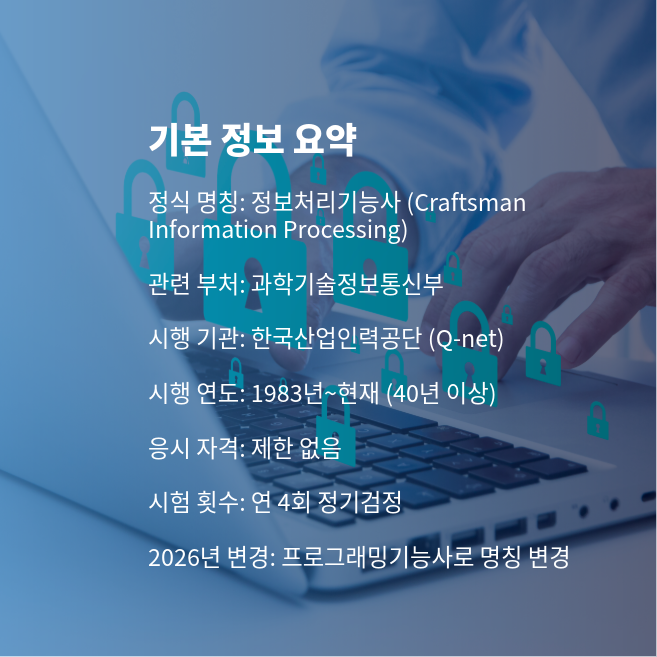 정보처리기능사는 컴퓨터 시스템의 운영 및 간단한 프로그램 개발 업무를 수행할 수 있는 기초 능력을 검증하는 국가기술자격입니다. 과학기술정보통신부가 주관하고 한국산업인력공단이 시행하며, 1983년부터 40년 넘게 운영되어 온 대표적인 IT 자격증입니다.
