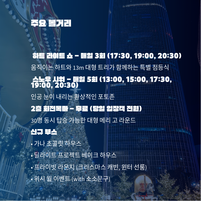 - 평일 오전~오후 3시가 가장 한산합니다. 주말과 크리스마스 당일(12/24~25)은 최대 혼잡이 예상되므로 피하시는 게 좋습니다.