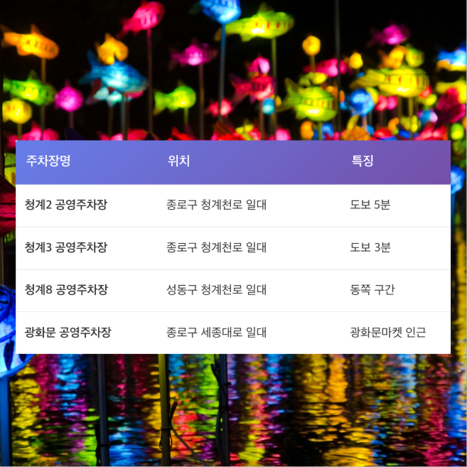- 청계천·광화문은 대중교통 이용을 강력히 권장합니다. 잠실은 롯데월드몰 지하 주차장 이용 가능하나 주말 저녁은 만차 가능성이 높습니다.