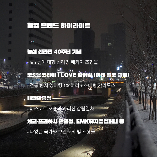 - 어린 자녀가 있다면 롯데타운 크리스마스(회전목마, 스노우 샤워)와 청계천 잉어킹(포켓몬)을 추천합니다. 두 곳 모두 아이들이 좋아하는 포토존과 체험 요소가 많습니다.