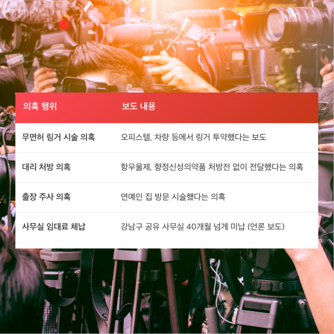 • 의혹: 무면허 의료행위 + 향정신성의약품 대리처방 의혹