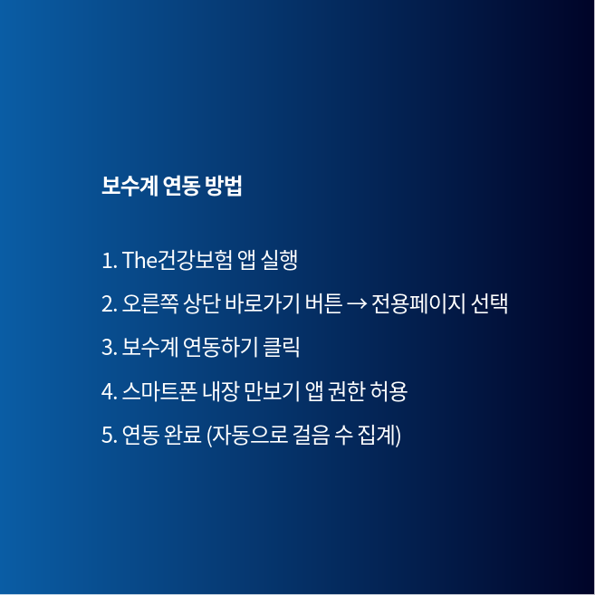 걸음 수 포인트를 적립받으려면 The건강보험 앱에서 스마트폰 보수계(만보기)를 반드시 연동해야 합니다.