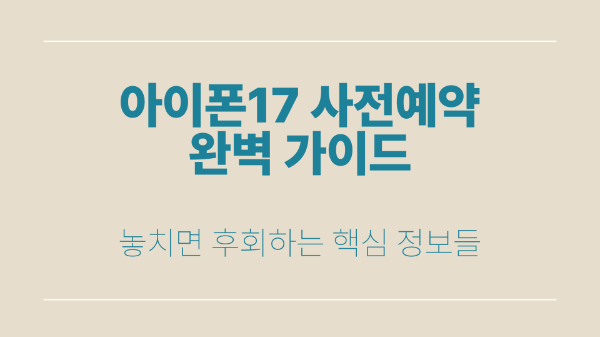 아이폰17 사전예약은 철저한 준비가 성공의 열쇠입니다. 아이폰17 사전예약 혜택을 꼼꼼히 비교하고, 아이폰17 예약 방법을 숙지하여 성공적인 예약을 하시기 바랍니다.