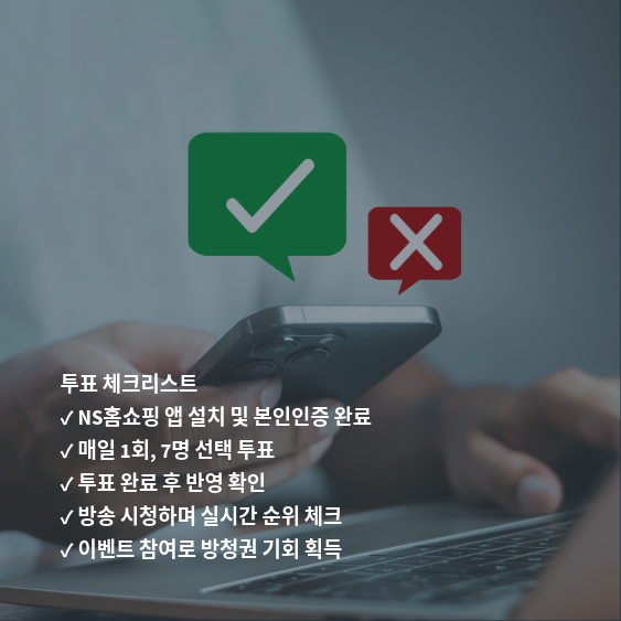투표는 본인인증이 완료된 ID 기준으로 매일 1회만 참여 가능합니다. 중복 투표나 부정 투표는 불가하며, 투표 결과는 실시간으로 집계되어 방송을 통해 공개됩니다. 투표 기간 및 규정은 프로그램 진행에 따라 변경될 수 있으니 NS홈쇼핑 앱의 공지사항을 수시로 확인하세요.