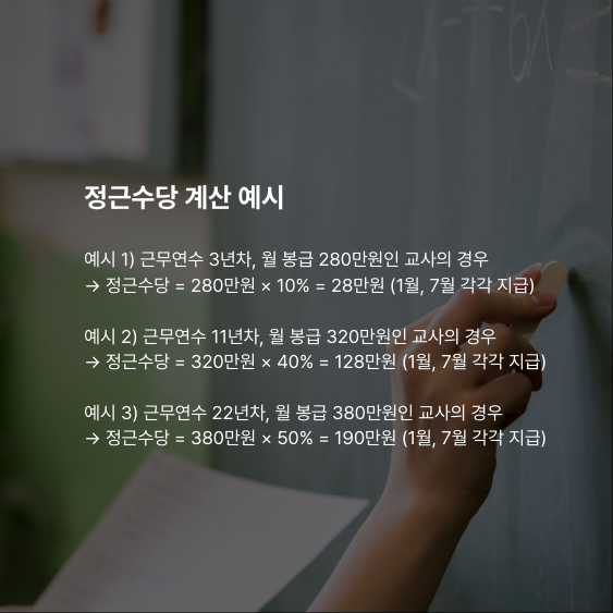 정근수당은 근무연수에 따라 본인의 월 봉급액을 기준으로 차등 지급됩니다. 2025년부터 1년 미만 교사에게도 정근수당이 신설되어 더 많은 교사들이 혜택을 받게 되었습니다.