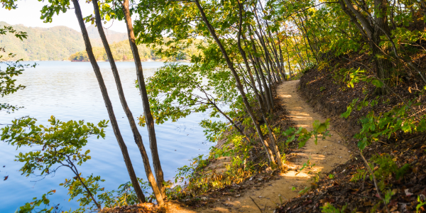 6개 코스 중 으뜸으로 꼽히는 5코스는 출발점인 '망향의 동산'으로 되돌아오는 유일한 회귀형 코스로, 횡성호를 가장 가까이에서 오롯이 만끽할 수 있습니다. A·B 두 갈래 구간으로 나뉘며 전체 약 4.5km, 3시간 소요입니다. 코스 중간중간 호수길 전망대·타이타닉 전망대·뱃머리 전망대·오솔길 전망대 등 포토존이 가득합니다. 경사가 완만한 흙길과 데크로드로 조성돼 어린아이나 노약자, 휠체어 이용자도 부담 없이 걸을 수 있습니다(산악형 휠체어 대여 가능). 5월이면 망향의 동산을 중심으로 횡성호수길축제가 열려 체험 행사와 공연도 함께 즐길 수 있습니다.