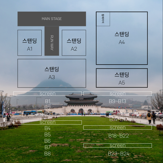 | 메인 스테이지 | 광화문 앞 북쪽 | 경복궁 광화문을 배경으로 한 메인 무대 |