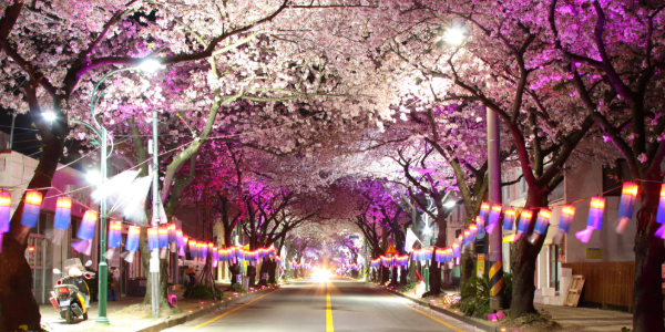 전농로는 제주시 도심에서 가장 유명한 왕벚꽃 거리입니다. 총 길이 1.2km, 수령 20~100년 이상의 왕벚나무가 터널을 이루는 이곳에서 매년 전농로 왕벚꽃 축제가 열립니다. 축제 기간에는 차 없는 거리로 운영돼 벚꽃 아래를 여유롭게 산책할 수 있으며, 야간 조명이 켜지면 낮과 다른 황홀한 분위기를 연출합니다.